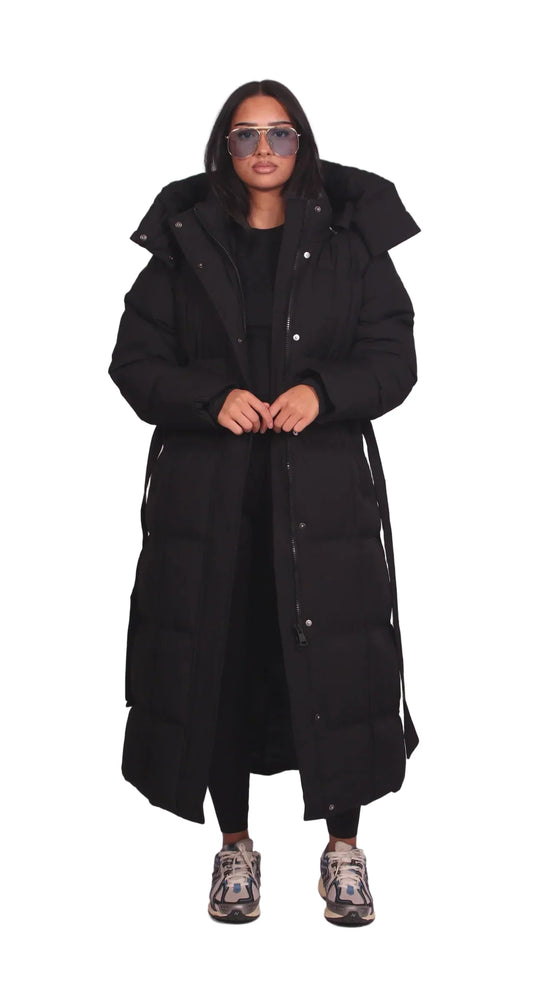 CARMEN – LANG VINTERJAKKE MED BÆLTE OG PUFFER-DESIGN